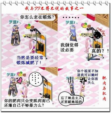 本次获奖作品中,除了有描述与朋友间的故事,还有一系列描述与人宠发生的有趣故事哦!如此图,某女在家锻炼身体,一旁的人宠小弗道:“你怎么老在锻炼?”某女回答:“当然是要经常锻炼减肥了。”小弗又道:“我倒觉得没必要。”某女大概以为小弗在夸自己身材修长,无需锻炼,便问:“真的?”小弗回眸一笑,留下句:“你的肥肉只会变肌肉而已,还嫌自己不够暴力么?”只见某女当即凑了小弗一拳,吼道:“你个混蛋,不知道我可以随时让你消失么!”