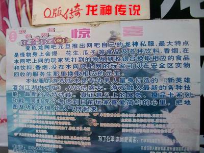 对于一些玩家来说,漫长且枯燥的练级是他们所不能忍受的,而且可能也没有那么多时间花在游戏练级上,他们只想体验到游戏后期的爽快,相对于官方服的缓慢练级速度,私服的打怪经验是官方服的N倍,更有角色一出生就是满级的私服,极大的缩短游戏练级时间, 同时,私服的免费更是一大亮点。只是天下没有免费的午餐,许多私服的寿命不过数月,安全保障更是无从谈起。