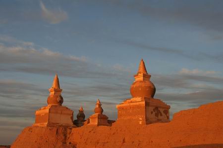 黑城遗址:内蒙古阿拉善盟额济纳旗**呼布镇以南的黑城遗址,又名黑水城。在西夏和元代时最为鼎盛,是古代丝绸之路上的重要城市。古城西北角上的那座著名的白塔,在缥缈的浮云中时隐时现,神秘莫测。在当地的土尔扈特蒙古族中,至今流传着有关这座古城的一个故事。