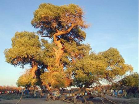 神树:树龄近千年,位于内蒙古额济纳旗。三百年前土尔扈特人初来额济纳,胡杨林木密集,其中“神树”巍然耸立挺拔,枝叶繁茂。于是,土尔扈特人怀着崇敬的心情将此树供奉为神树。时至今日,每当牧民途经这里,都要求助神树,希望来年风调雨顺,畜草兴旺。