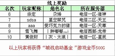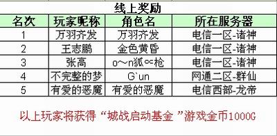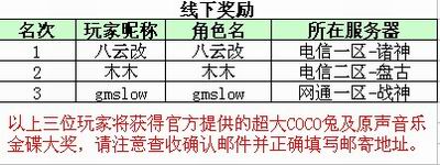 按玩家游戏时间进行排行,榜单前5名玩家将得到游戏金币1000G,5-10名玩家将得游戏金币500G.同时,活动进行期间,所有参与玩家均可参与每周一次的线下抽奖活动,获奖玩家将得到“游戏原声金碟”、“超大型COCO兔玩偶”惊喜大奖。(每周抽取3名)