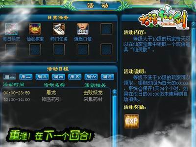 多款仙剑风活动任务放出:侠之试炼,仙剑探宝,天将宝盒,逍遥口信等等!游戏采用活动打包设计,所有活动当日活动明细都将清除的展示在活动面板中,玩家可以轻松点击查阅,您没有理由错过任何一款精彩活动,赢得游戏奖励!