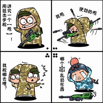 都说用狙击步枪讲究一个“甩”,而实践是练习技术的唯一途径,于是菜鸟新兵开始了甩枪练习,只见他左甩甩,右甩甩,上甩甩,下甩甩,360°全面使劲的甩……最后,狙击步枪竟然被甩的不翼而飞。