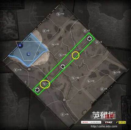 地图“海滩袭击战”具有《英雄连Online》的战场特色。三个胜利点并排为中轴线,将战场一分为二,+10的大资源点被平均分布在两边。然而,纵向的战场有两块包围式资源点,一旦被敌人切断,即使两边占点成功,也无法获得资源补给。这就意味着,指挥官必须做到耳听六路,眼观八方,多线战斗,绝不姑息。任何一个疏忽,都可能导致战斗的最终失败。