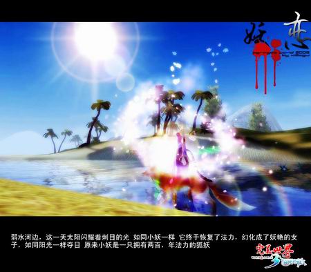 弱水河边,这一天太阳闪耀着刺目的光,如同小妖一样。它终于恢复了法力,幻化成了妖艳的女子,如同阳光一样夺目。原来,小妖是一只拥有两百年法力的狐妖。