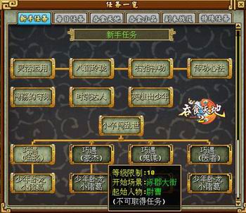 任务树开启任务天书中的任务树,强大的树状任务导航系统就显示在你面前啦!游戏中所有的任务,包括未做的、未接的、以及不可取得的,都会一一呈现在你面前!每个任务都有详细的提示,还可以自动导航!