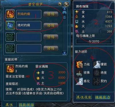 ③是法宝技能学习所需要的等级,和魂魄的数量。