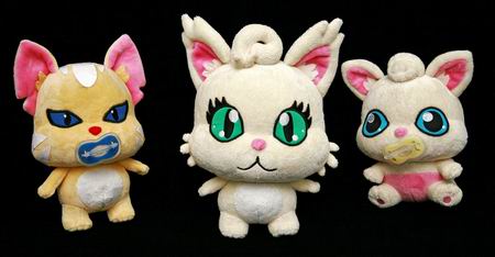 玩偶排排坐:(左起)婴儿期恶魔猫、成年期天使猫、婴儿期天使猫