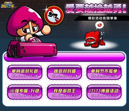 眼看一年一度的光棍节就要到来了,不过《跑跑卡丁车》赛场中的各位钻石王老五们早就做好了准备,单身派对礼包外加情侣对对碰和单身节不孤单两大活动,让你喜结良缘从此告别单身!