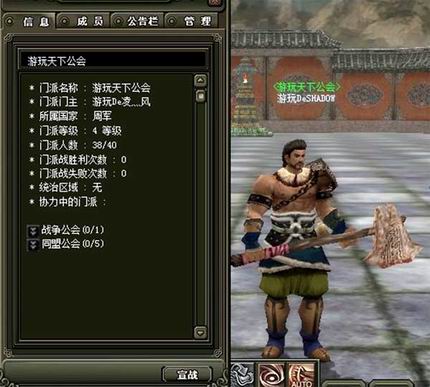 门派系统:我们游玩天下游戏公会进入《神将》后第一目标就是建立属于我们自己的门派,于以前版本不同的是,现在公测版本只需要15级和一万铜钱就能建立门派了,所以我们在最短的时间里冲到15级,开创了“游玩天下公会”门派,可惜新建门派只能招收20人,好多公会会员都没办法全加到门派中来。于是我们集合公会力量,努力升级,终于在几天后第一个把公会升级到了4级公会,公会名字也由原来的白色变为了绿色~门派人数也翻了一倍~
