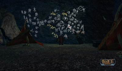 当然,作为大名鼎鼎的哥布林镇,可不是只有被玩家练级这么一个用处。哥布林是一个古老的种族,也拥有自己的文明,而这点,在游戏中完全得以体现。细心的玩家可以在哥布林镇发现很多壁画,更有一幅壁画描绘了13矮人和比尔博、甘道夫一行人被困在着火的森林里,风王出现救走他们的情形。哥布林用一幅幅涂鸦描绘出了他们眼中的中土世界。