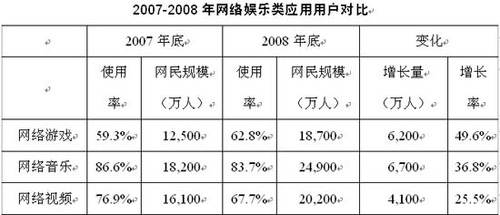 中国互联网络信息中心(CNNIC)发布的第23次中国互联网调查报告显示,2008年网络游戏用户规模继续保持增长的态势,用户使用比例从2007年的59.3%升至2008年的62.8%,这主要受益于网络游戏产品内容以及形式的丰富:一方面,网络游戏产品内容的多样化加大了其向高低两个年龄段用户的扩张力度;另一方面,网页游戏作为新兴的游戏形式在2008年得到了迅速的发展,其无需下载客户端、操作方便等特性使工作时间玩游戏成为可能性,而SNS网站加入了网页游戏因素,又进一步加大了网络游戏的传播范围。