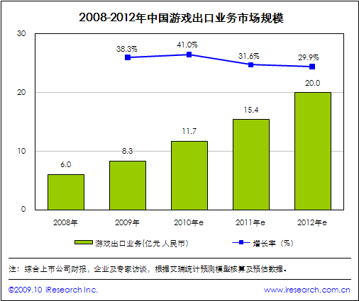 中国网络游戏出口这一新型的商业模式自2006年兴起至今,短短4年中完成了从无到有的积累过程,2009年收入达到8.3亿元,同比增长38.3%。艾瑞认为,游戏出口收入虽然已经达到一定数额,但相对于整个网游市场200多亿的大蛋糕,还处于萌芽状态,随着中国游戏研发团队的创意不断涌现和技术能力提高,出口到国外的产品数量及价格还将不断增加,预计在未来三年中,游戏出口市场将保持每年30%左右的增长率,至2012年,这一产业的市场规模将有望达到20亿元。