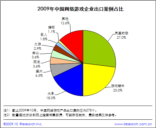 截止2009年中国网络游戏出口案例总数已经达到278起①,其中完美时空以27%的出口量居第一,游戏蜗牛与大承网络两家则分别占23%与18%,超过众多大型企业居第二和第三位。纵观三甲企业,有两个非常明显的共同点,一是3D产品占大多数;二是在除了东南亚以外的欧美国家也有涉猎。