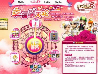韩国全3D休闲MMORPG《梦幻龙族(专区 截图)》自开启幸福摩天轮活动后,深受广大玩家的追捧。在玩家的热切呼吁下,《梦幻龙族(专区 截图)》已于11月26日开启了“幸福摩天轮”第二期!活动一经开启,便得到了玩家的热情参与,截止今日,已有数万名玩家参与抽奖,数百名幸运的玩家获得了《梦幻龙族》绝版QQ秀以及Ipod shuffle等奖励!