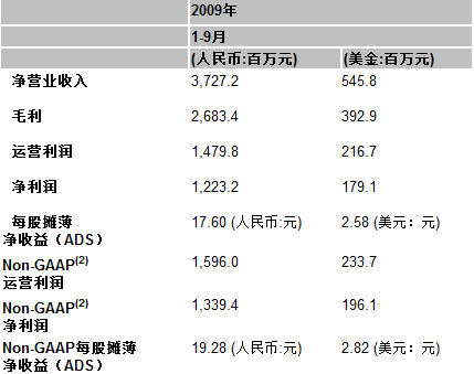 * 2009前九个月净营业收入较去年同期增长45.9%至人民币37.27亿元,运营利润(非美国通用会计准则)较去年同期增长49.0%至人民币15.96亿元,每股摊薄净收益(非美国通用会计准则)为人民币19.28元。