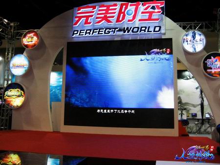 网博会当天,在“完美时空”四个醒目的文字标示下,显示屏上播放着《完美世界前传-人鱼传说》的背景视频。前来参加网博会的朋友们可以通过视频了解《完美前传》的背景故事,并在旁边设立的电脑前进行体验!
