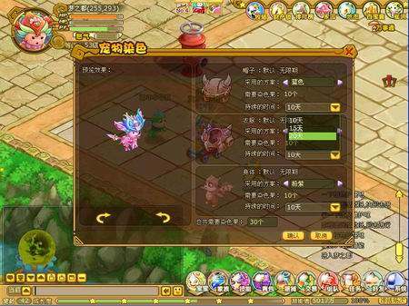 当玩家进入梦之都找到负责染色的NPC,进入染色界面后就可以选择衣服、帽子、身体3个部分的颜色,并可选择染色的有效时间,有效时间越长消耗的染色果越多。调整好你要选的颜色之后,点击界面中的确定按钮即可完成染色。