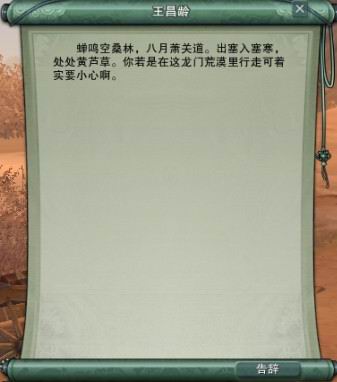 这片大漠虽然看上去了无生气,一片沉寂,实则杀机暗伏。方才一阵沙暴过后,又来了一群劫掠的马贼,竟然连诗人的手稿都抢去了。天灾人祸,王昌龄一点都没落下。一向仰慕文化人的少侠客们,当此危难之时,自然是要挺身而出,拔刀相助了。先是帮王昌龄从长牙帮马贼手中夺回了失落的诗稿,又在大漠的风沙中将吹散的诗稿捡回,总算是把这一部诗稿完整地交还给了诗人。同时,也为中华诗歌捡回了一个瑰宝,因为,这失而复得的诗稿就是传诵千古的名篇《从军行》。是的,没错,我们从马贼手中抢回来的是“更吹羌笛关山月,无那金闺万里愁”;我们从风沙中捡回来的是“大漠风尘日色昏,红旗半卷出辕门”;我们交还给诗人的是“黄沙百战穿金甲,不破楼兰终不还!”