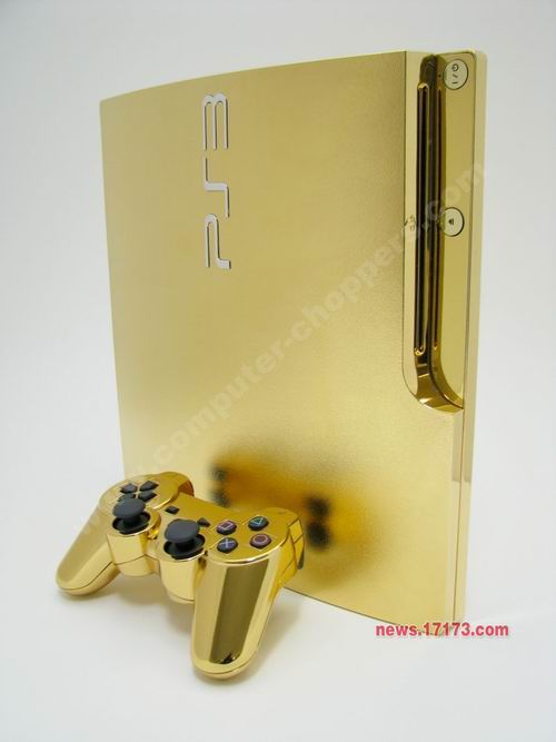 由国外著名的电子产品改装定制公司Computer Choppers制作的限量版的系列黄金游戏机今天正式推出了第一款,由24K纯金打造外壳的PS3超薄型主机,该主机将通过eBay以竞拍的形式出售,起拍价定位4999美元。