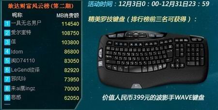 《SD敢达Online》“财富风云榜,代币返还大赠送”活动火热进行中,如果你也想获得上榜的机会。那么就在下周疯狂的SHOPPING一把,也许下一个出现在榜单上的就是你哦!活动结束后,进入前10名将获得代币返还,冲入前三的还将获得价值人民币399元的波影手WAVE键盘!