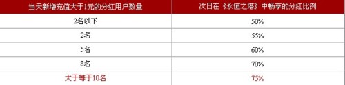 从2009年12月11日到2010年1月10日为止,所有盛大游戏《永恒之塔》的玩家都可以作为永恒之塔的推广员,每天都可以享受到自己的分红用户所充值金额的50%以上分红奖励,最高可达75%。也就是说,分红用户每充值1元,作为他的推广员,你就有资格获得最高0.75元的返利!