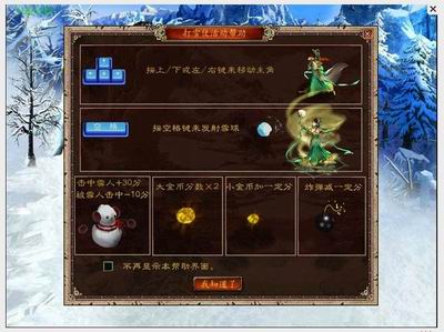50级以上的玩家在圣诞小雪人处可领取任务,领取任务后使用任务道具栏内的雪球寻找雪人的位置,点击雪人进入游戏流程。玩家可进行左右移动闪避雪人丢来的雪球,同时可以使用左键对雪人进行还击,每打中雪人一次可得30分,每被雪人打中一次扣除10分,请注意,在游戏中会有活泼的狐狸进行捣乱,抛洒金币和炸弹,千万分辨清楚是金币还是炸弹哦,撞击到炸弹可是会被扣分的!游戏中得分越高,获得优秀奖励的几率越大。