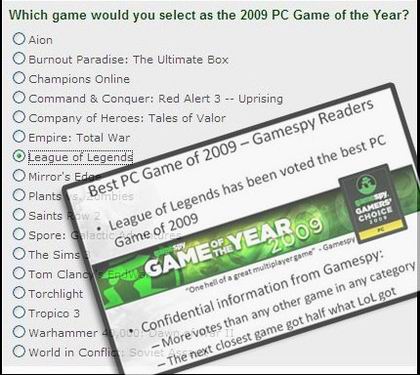 在辞旧迎新之际盘点09年精品网游,一款让无数游戏爱好者充满期待的英雄对战网游—《League of Legends》(简称LoL)最终在万众瞩目下轻松摘取“GAMESPY玩家投票年度最佳PC游戏”的桂冠。此次LOL的问鼎,不但向所有人宣告了LOL在北美上市的成功,也向无数翘首等待的国内玩家展现了游戏无与伦比的魅力与人气。