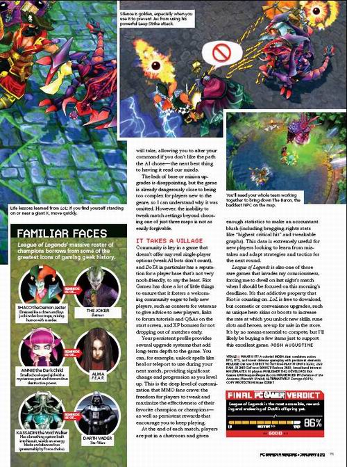 除了超高的人气和火爆的参与度外,游戏本身独有的玩法和经典的特色也在专业领域中获得了极高的评价。向来苛刻、严格的美国最专业杂志《PCGAMER》在经过综合品评后,毫不犹豫的给出了86分的超高评分。对LoL来说,这无疑是从技术到人气,从玩法到创意的全面肯定,也是游戏能获得如此高人气的另类诠释。