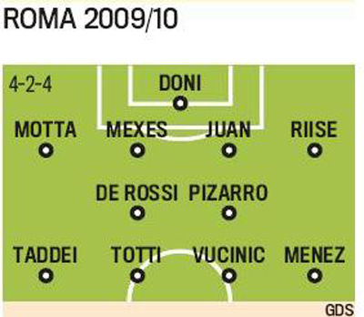如今意甲的罗马队,也是经常采用搏命424的代表球队之一,我们可以借助《FIFA online 2》看一下红狼军团的人员部署是否合理,锋线上右路是巴西人塔代伊,盘带81传中80可以再边路胜任突破和助攻,而中路的黑山前锋武奇尼齐则是标准的中锋,在《FIFA online 2》里87的射门精度与83的速度加速专门负责接应和最后的门前一脚,而左边路的梅内盘带87控球86短传83,与左边塔代伊遥相呼应为中路球员提供弹药。另外球队核心托蒂以《FIFA online 2》中巨星的几乎全部90+数值隐藏在武奇尼齐身后,既可以回撤接应中场也可以在锋线上攻城拔寨。
