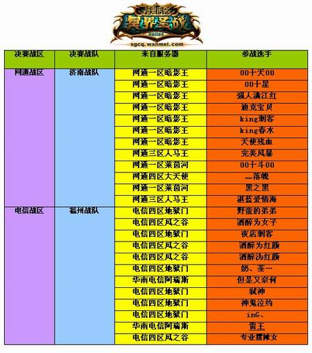 《神鬼传奇》首届城市挑战黄金联赛——总决赛参战选手名单: