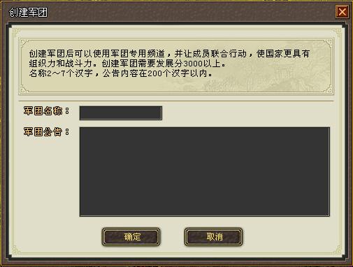 创建军团不花费铜钱,需个人发展分3000以上,军团人数上限200人。