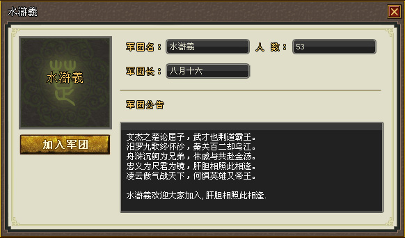 在军团菜单中选择"加入军团",可以看到当前国家已有军团一览。选择军团可查看军团详情,点击"加入军团"即可向军团长发送加入军团申请。军团长同意申请,加入军团成功,军团加入以邮件形式通知,并在聊天频道提示军团长。