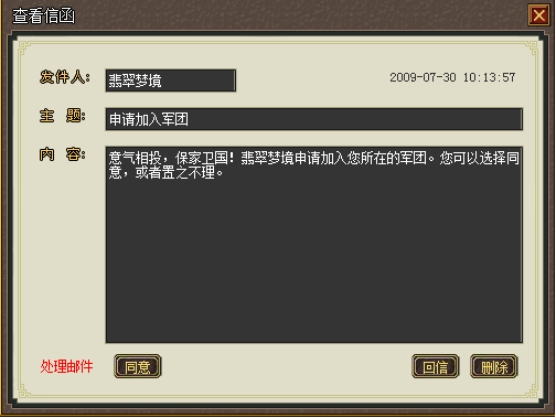 本国国民在查询军团列兵并申请加入,军团长会收到私人申请信(同时以聊天室消息方式通知),可批准或搁置。