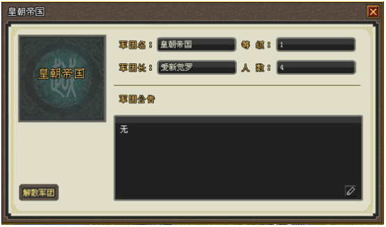 只能军团长操作,并解除所有成员的军团属性。****,国家所属的所有玩家军团自动解散。
