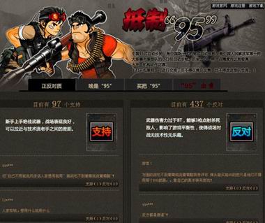 基于民意沸腾,弹头奇兵官方罕见的推出了「由玩家决定95存废的**」。在该活动中,玩家可以自由表达心声,同时投下支持或反对的一票,官方承诺如果玩家的心意一致,该产品于票数统计结束后立即下架,绝无二言。