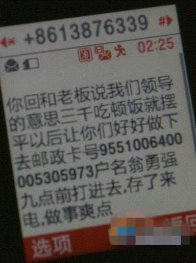 当晚,这名男子给吴先生发来短信:我们领导的意思是给三千元好处费,外加一顿饭,这样就可以摆平此事了,以后让吴先生店铺好好做生意。