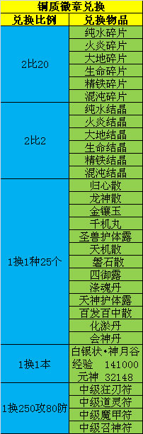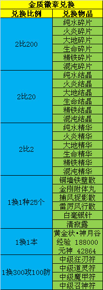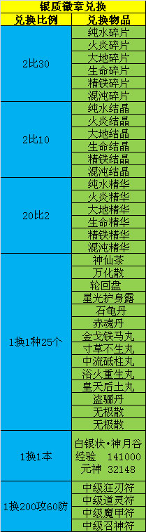 三种成就徽章的用途可是不小哦,除了可以兑换各类仙丹、经验书和攻击优化符外,还可以兑换各种神月材料。如下表所示: