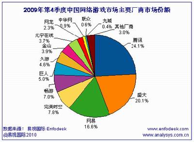 据易观国际对中国网络游戏市场的研究发现,排名前三的厂商中,腾讯以18.14亿元收入占据24.1%的市场份额,主要原因在于其《地下城与勇士》《穿越火线》游戏用户付费习惯的成熟及营销的发力。盛大本季度收入为15.1亿元,以20.1%的市场份额排名第二,《传奇》系列和《永恒之塔》自然增长,网易本季度排名第三,以12.45亿元收入占16.6%市场份额,营收大幅增长的原因在于《魔兽世界》的商业化运营,在老用户回归和新用户的增加情况良好,但不少用户由于更新问题仍持观望态度或停留于海外服务器。