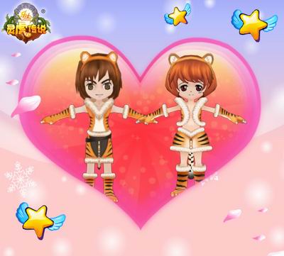 新版本“灵虎传说”为了配合虎年的热闹气氛,将隆重推出男女两款虎年特色时装。这两款喜庆华丽的AVATAR道具,不但表现出了灵虎的俏皮可爱,也承载着新一年对大家最美好的祝福,更可穿上它一同度过浪漫的情人节,真是一举数得!