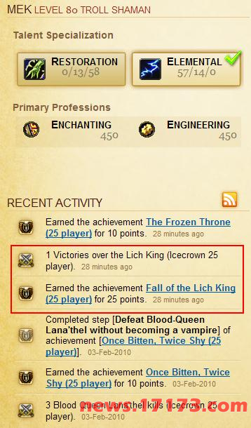 Ensidia公会成员的装备数据库显示:28分钟前即北京时间8点38分Ensidia第一次击杀25人模式的巫妖王,并完成“巫妖王的陨落”成就