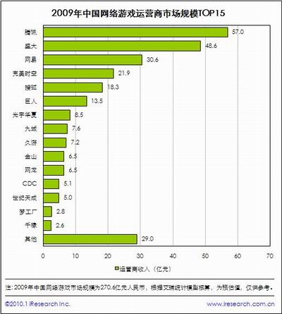 根据iResearch艾瑞咨询推出的网民连续用户行为研究系统iUserTracker最新数据显示,中青宝网2009年运营情况最好的产品是其红色题材作品《抗战(专区)英雄传Online》,月度覆盖人数在50万人左右,在所有游戏产品中排名35名左右,属中等偏上的位置。虽然中青宝网的游戏产品表现可圈可点,但在排名TOP15的企业中,非上市公司仅为5家;在已经上市的企业中,除了畅游和盛大游戏是在2009年分拆上市以外,其余企业的上市时间都集中在2004-2007年之间,可见中青宝网的规模在整个行业中并不算大,中国游戏行业处收入5000万以上,能达到上市要求的企业至少还有10家以上。