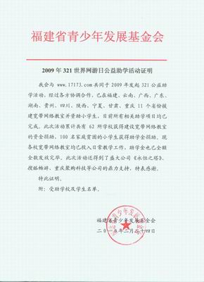 小亮们的梦想是17173“321世界网游日”公益慈善活动帮他们实现的。早在2009年,小亮所在的学校就被“321世界网游日”慈善活动列入了援建学校之一。除了他所在的学校,17173与福建的青年基金会合作,已在福建、广西、广东、湖南、贵州、四川、重庆、陕西、甘肃、宁夏等11个省份援建了宽带网络教室并资助小学生。截止目前为止,上述地区共有62所学校和100名贫困家庭的小学生获得了援助。