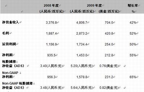 2009全年净营业收入同比增长42%至48.07亿元人民币;净利润同比增长55%至14.53亿元人民币;每股摊薄净收益5.20元人民币。