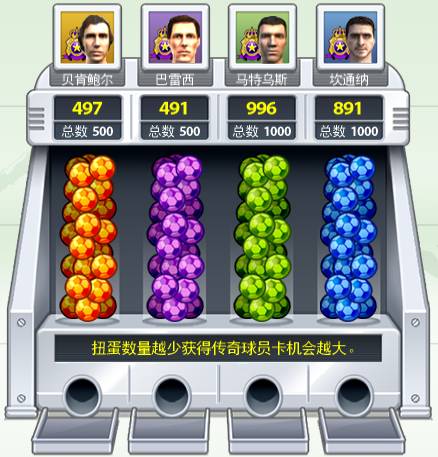 3.每当传奇球员产生以后,相应的扭蛋机剩余小足球数量就将被重置,恢复到初始值。例如第一个扭蛋机初始有500个小足球,当您在第400个小足球抽到传奇球员后,这个扭蛋机中的小足球就将被重置,变回原来的500个小足球。