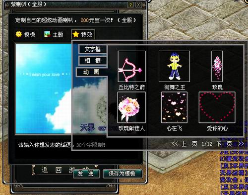 “动漫传情”包括模板、主题和特效三种选择。其中模板是《预言Online》官方定制好的一些场景,包括趣味、唯美、卡通和节日模板;主题则可以让玩家选择自己上传的各类型图片素材,包括一些炫动的卡通动漫图片;特效则包括文字框、相框和动画三种,能够使玩家选择的图片和文字“动”起来,相当于用“美图秀秀”PS自己心仪的图片哦~