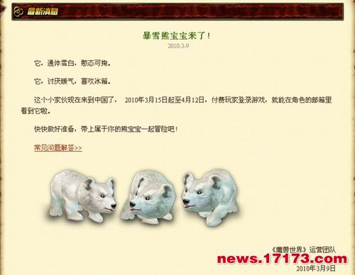 3月9日消息:《魔兽世界》的付费用户只要在2010年3月15日0点0分至4月12日23:59分之间登录游戏,就可以通过游戏内的邮箱拿到暴雪熊宝宝。