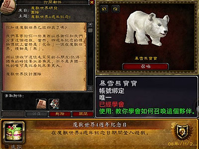 为了纪念魔兽世界四周年而赠送给全球WOW玩家暴雪熊宝宝终于在五周年活动都已举办完毕后,长途跋涉从北极来到地处火星的国服,魔兽世界大陆地区官方网站今天宣布:2010年3月15日起至4月12日,付费玩家登录游戏,就能在角色的邮箱里看到这个可爱的熊宝宝啦。