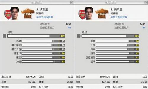在本特纳打入前两球后,第63和66分钟纳斯里和埃布埃4分钟内连入两球为阿森纳锁定胜局。纳斯里面对波尔图3名防守队员的防守灵巧盘带突入禁区右侧小角度近劲射破门,《FIFA online 2》中纳斯里进攻479,任意球速度和加速都是他的强项。盘带能力更是出神入化在游戏里盘带86控球87,传球也非常出色。
