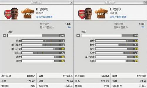 作为由有边后卫转型过来的攻击性边前卫,埃布埃在经过一段时间的低迷之后终于又回到了自己最好的状态。接阿尔沙文助攻后,面对门将轻松骗过对方的重心,左脚推射空门得分。《FIFA online 2》中埃布埃的进攻和组织能力也非常不错,84的射门速度和加速也都在85以上。盘带、传中、反应速度和控球这些边前卫的重要指标都是黄色的80以上,现在已经成为阿森纳右边前卫位置上重要的球员。